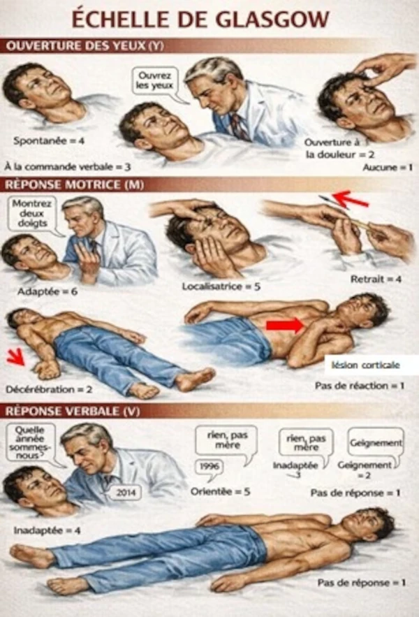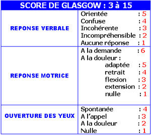 Le score varie de 3 (coma profond) à 15 (état de conscience normal).