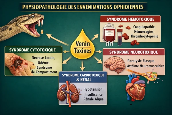 - Syndrome hémotoxique : coagulopathies, hémorragies, thrombocytopénie, venoms-induced consumption coagulopathy (VICC).