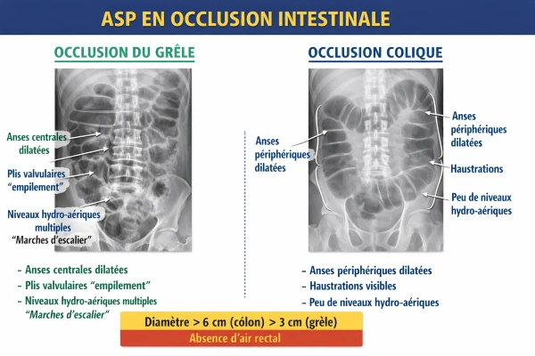 - Dilatation intestinale : grêle > 25–30 mm, côlon > 60 mm