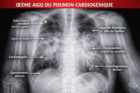 👉 La combinaison cardiomégalie + redistribution vasculaire + opacités alvéolaires bilatérales est très évocatrice d’un OAP cardiogénique.