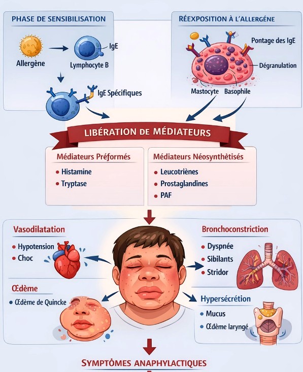 Ces médiateurs entraînent : vasodilatation périphérique, augmentation de la perméabilité capillaire, bronchoconstriction, hypersécrétion muqueuse, œdème tissulaire